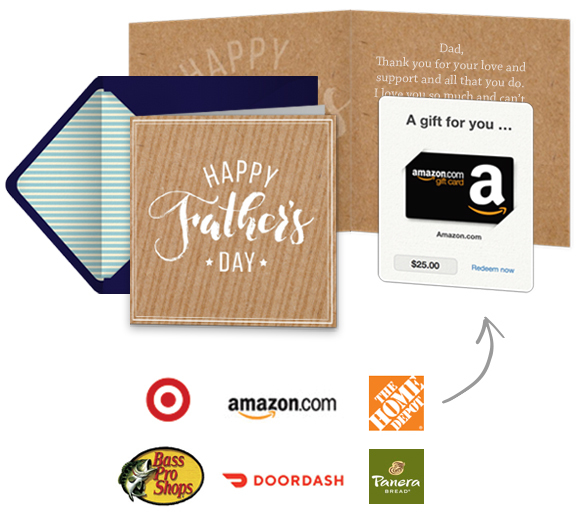 Punchbowl has a large selection of free eCards for Father’s Day that you can send through email or text message. Once you pick your favorite card design and add a personal message, our platform will automatically prompt you to add a gift card to your greeting card. Father’s Day cards and gift cards can even be scheduled in advance for delivery on Father’s Day or sent from your phone the day of!