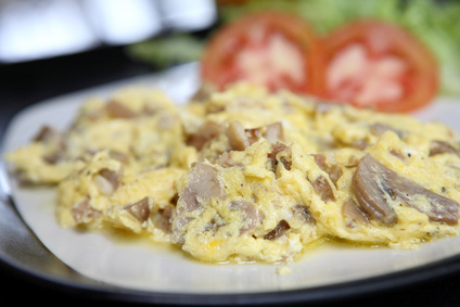 Slice the mushrooms into large pieces. Cook in 2 tablespoons of butter over low heat to soften. Combine all the eggs and beat at least 10 minutes until thickened. Stir in the crème fraiche, chives, salt, and crushed peppercorns. Melt the other tablespoon of butter in a fresh pan over low heat. Add the egg mixture and cook 2 minutes. When the edges begin to look done, but the omelet is still soft in the middle, add the sliced mushrooms. Continue to heat until the eggs are cooked through.