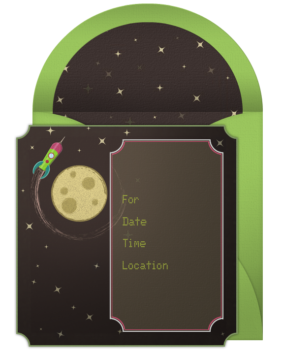 - Invitations: Browse through Punchbowl’s collection of digital birthday invitations and find an outer space design to kick-off the party theme. Include details such as the name of the party, guest of honor, date, time, and location. Use creative wording on the invitations such as: “Join us for Tyler’s 7th birthday party. It will be out of this world!”