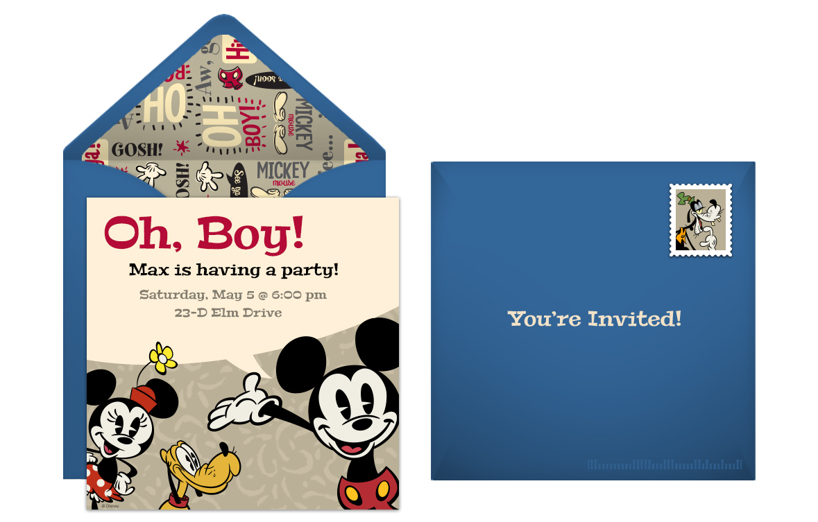 Oh Boy, it’s time to celebrate the guest of honor with a Mickey Mouse birthday party! It's the perfect theme for a timeless birthday party. Choose from our favorite Mickey Mouse themed online invitations, and start planning your party. Punchbowl now offers exclusive online invitations for Disney-themed parties, so start your party planning with this retro Mickey Mouse invitation featuring a coordinating envelope liner and postage stamp.