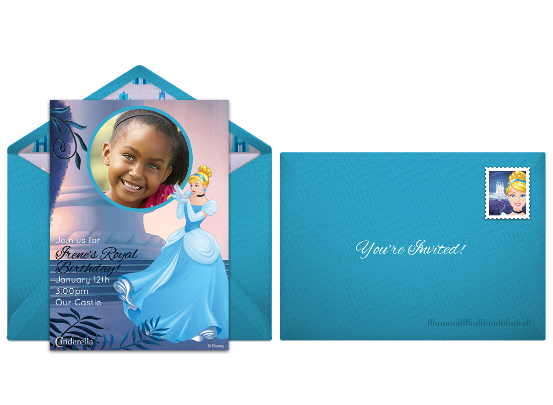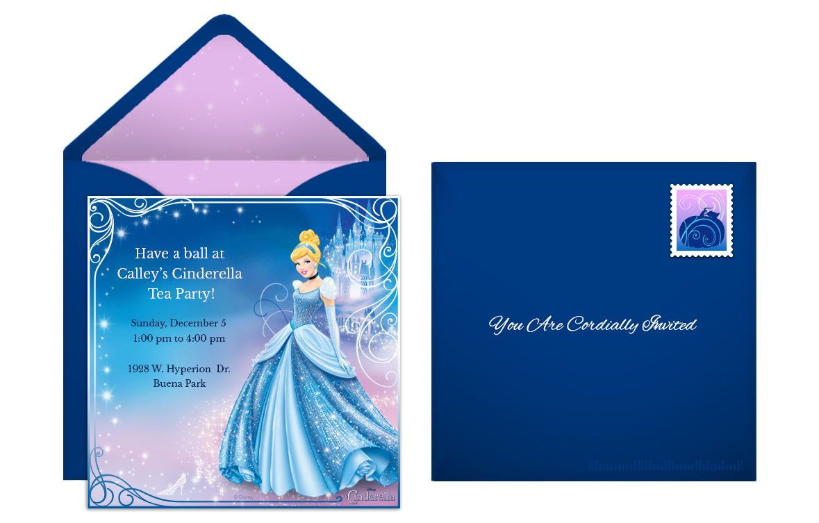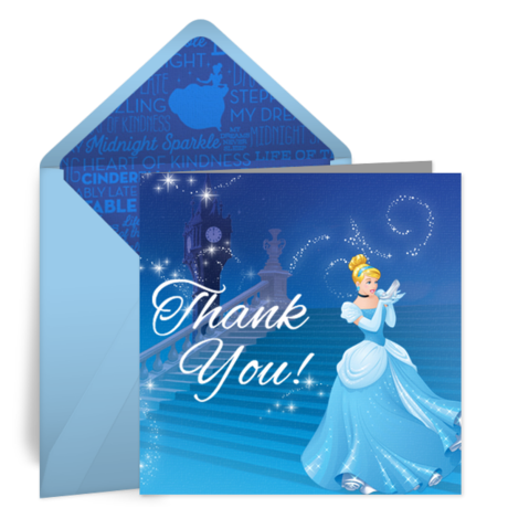 • Cinderella Thank You Cards: After the celebration, send Cinderella Thank You cards to let guests know how much you appreciate them attending. Personalize the cards and send via text or email in minutes.