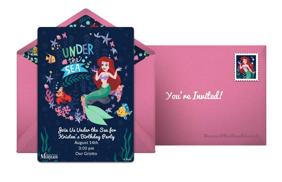 Make a splash with a magical Little Mermaid birthday party inspired by Princess Ariel! To begin your party planning, personalize a dazzling digital invitation that will enchant your guests from the moment they open it. Punchbowl offers Little Mermaid online invitations with whimsical scenes perfect for any young daydreamer.