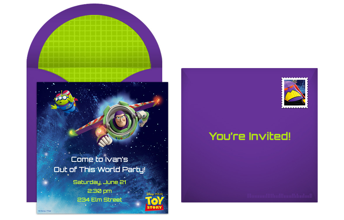 Punchbowl now offers exclusive Disney online invitations, so choose a free Toy Story online invitation to get started. This action-packed Toy Story invitation features the one and only Buzz Lightyear and one of the Aliens flying through space, ready to celebrate. The bright purple and green color palette and the Zurg stamp design will inspire your guests to travel “To infinity and beyond!”