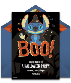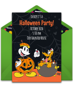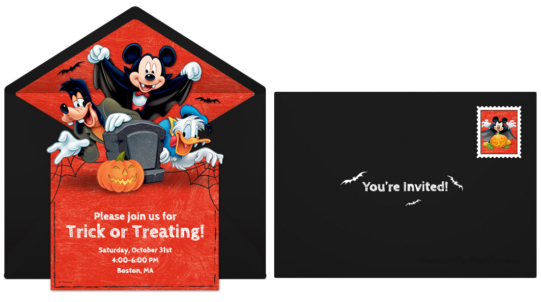 Create a magical, spooky (yet sweet) Disney Halloween party with the perfect online invitation! Punchbowl offers online Disney Halloween invitations like this free Disney Halloween invitation starring Mickey Mouse, Goofy, and Donald Duck in a fun, spooky Halloween scene. This design also features a coordinating envelope liner and vampire Mickey Mouse stamp – sure to impress all of your ghost and goblin guests!