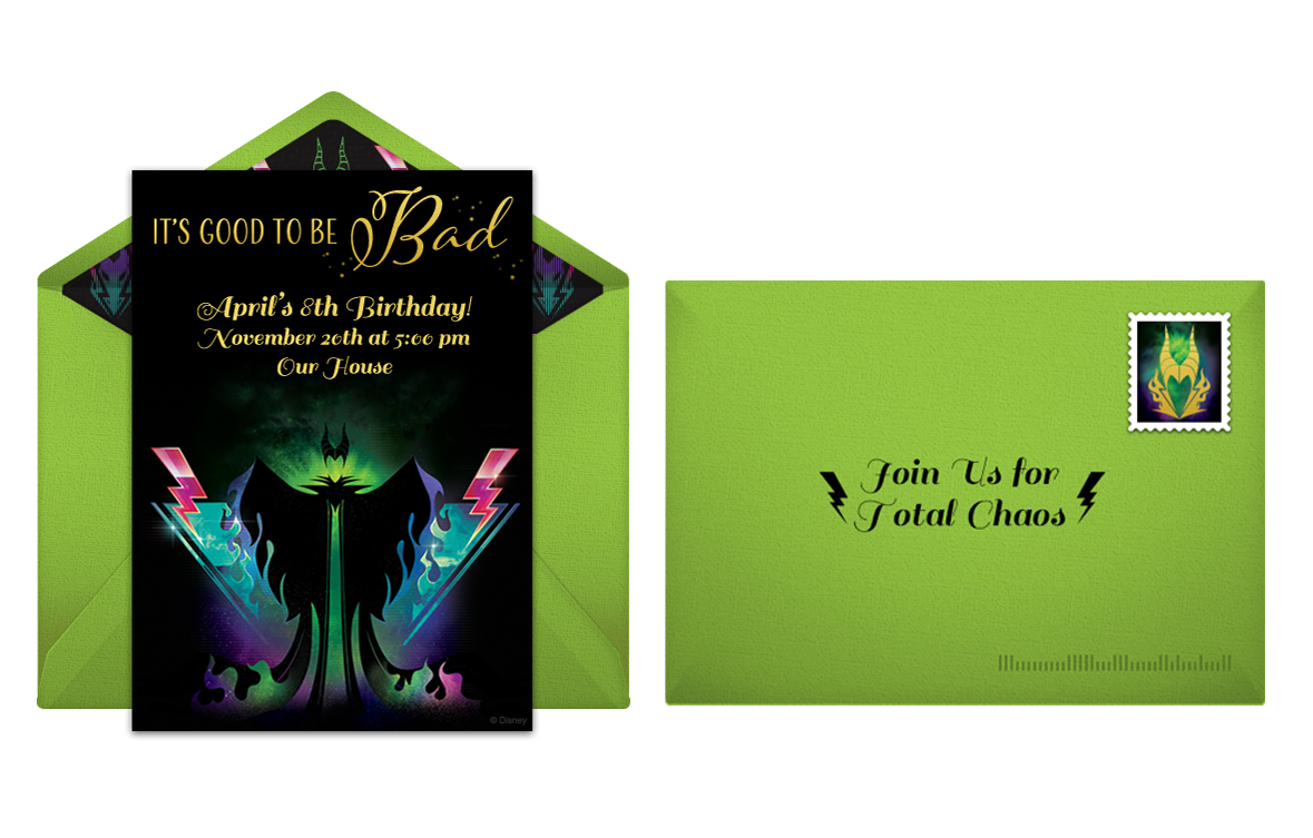 Or check out this unique Maleficent online invitation featuring a dark, imaginative design. This design also features a coordinating envelope liner and Maleficent stamp. It's the perfect way to set the scene for your Halloween shindig!
