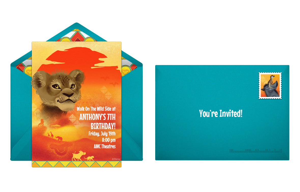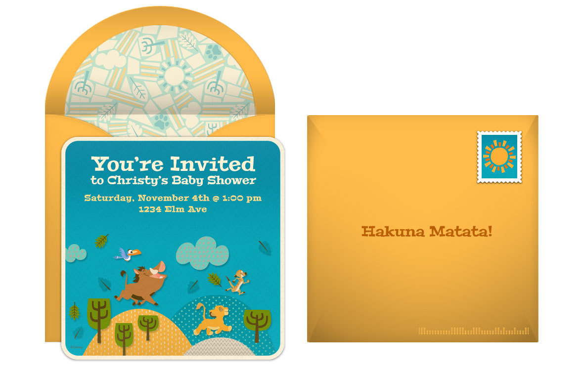Or, start your Lion King party planning with a free online party invitation featuring Simba and all his buddies. They’re ready for whatever lies ahead with this graphic envelope liner and playful invitation featuring Simba, Pumbaa, Zazu, and Timon. Guests will love the whimsical details including the “Hakuna Matata” greeting and sunshine postage stamp.