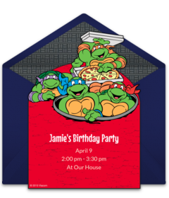 - Teenage Mutant Ninja Turtles: If your birthday boy or girl loves an action-packed day, then a Teenage Mutant Ninja Turtles theme is a fabulous choice. Easy-to-make Ninja Turtle masks are the perfect way for the little superheroes to feel like they’re one of the Ninja Turtles. Incorporate a game of Pin-the-Pepperoni-on-the-Pizza into your party because we all know the Ninja Turtles love pizza! Here are more brilliant Ninja Turtles party ideas and our online Ninja Turle invitations!