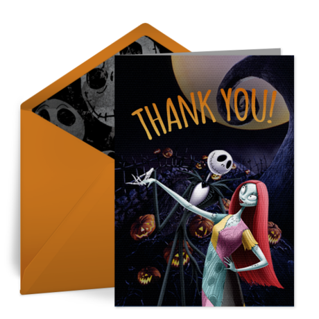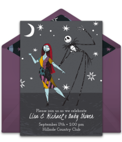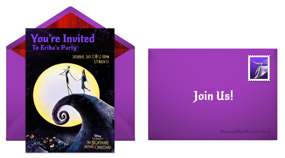 Punchbowl offers exclusive online invitations for Disney-themed parties, including The Nightmare Before Christmas! Choose this mysterious Nightmare Before Christmas online invitation to get started. It features the one and only Jack Skellington with darling Sally, as they stroll in the moonlight. A colorful envelope liner and Zero stamp make this free Nightmare Before Christmas invite a delightfully devilish way to impress guests and add some Disney magic to your party!