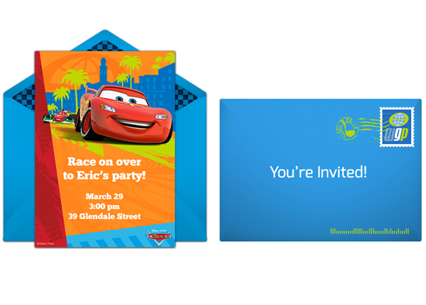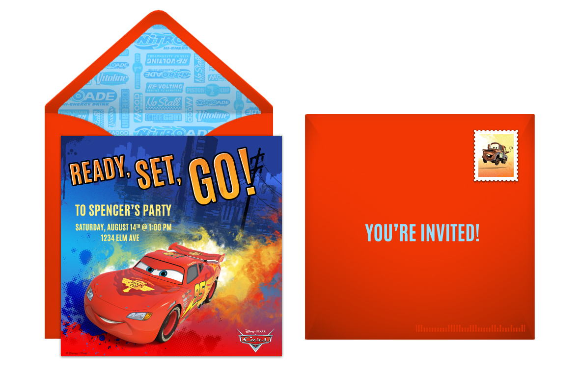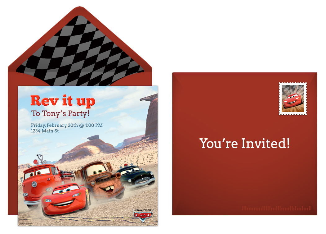 Punchbowl offers a huge collection of online invitations for Disney-themed parties so get started by customizing your Cars party invitation. The free Cars invitation features Lightening McQueen and Francesco Bernouli racing to the finish line. Featuring a coordinating envelope liner and stamp, you’ll be certain to win the Piston Cup for your next event.