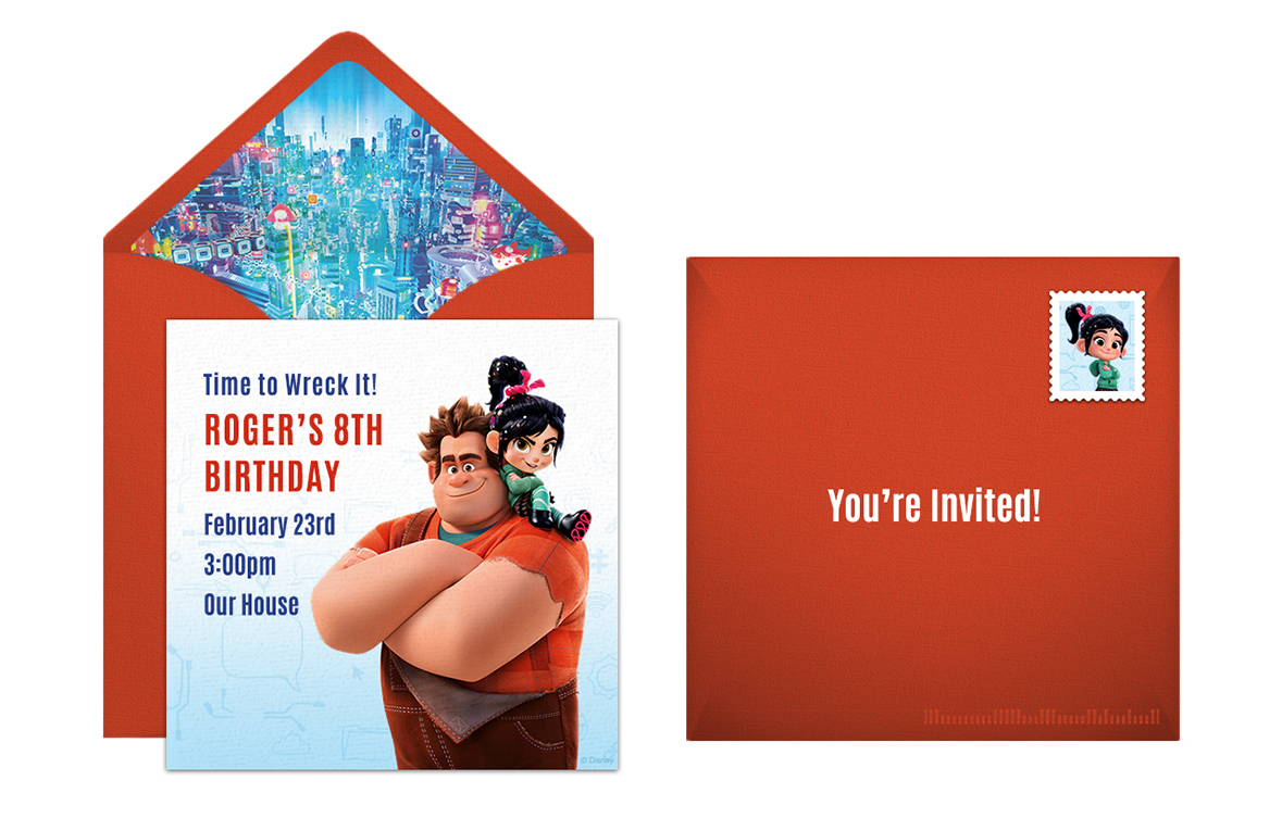 Customize your invite with important information your guests need to know – location, date, time, and any other details you want to include. Once you’ve personalized your design, you can easily share your invitations with guests via email and social media. After you send your invites, you can start planning a one-of-a-kind Wreck It Ralph themed birthday party!