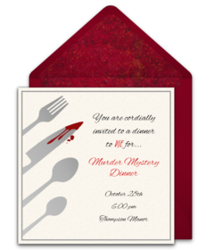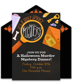 - Invitations: Send out free Halloween invitations with details such as the day and time of the party along with a link to the video chat platform you plan to use. You can also send a personal message to each guest with their invitation to give them a detailed description of the character they will play. All of the guests will be suspects of the murder of John or Jane Doe (a fictional character) and everyone will use clues to try and solve the crime. If you want to customize your invite, create your own unique Halloween design with our invitation maker layouts where you can upload your own photo or design.