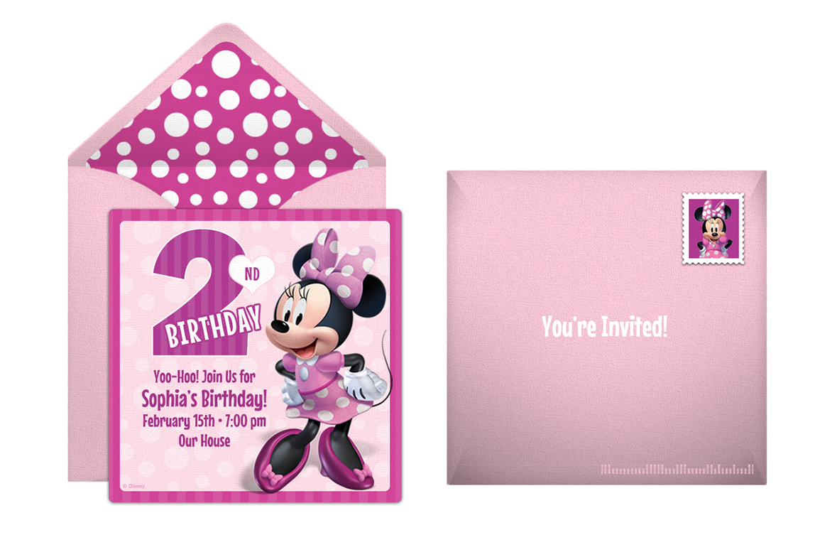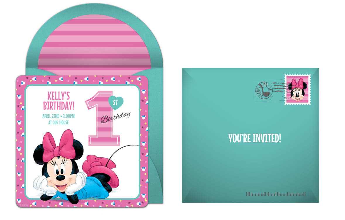 Punchbowl now offers exclusive online invitations for Disney-themed parties, so choose this pretty-in-pink Minnie’s 1st birthday invitation to get started! With an adorable striped liner and Minnie-themed stamp, this Minnie Mouse invite is sure to charm your guests, and add some Disney magic to your party!