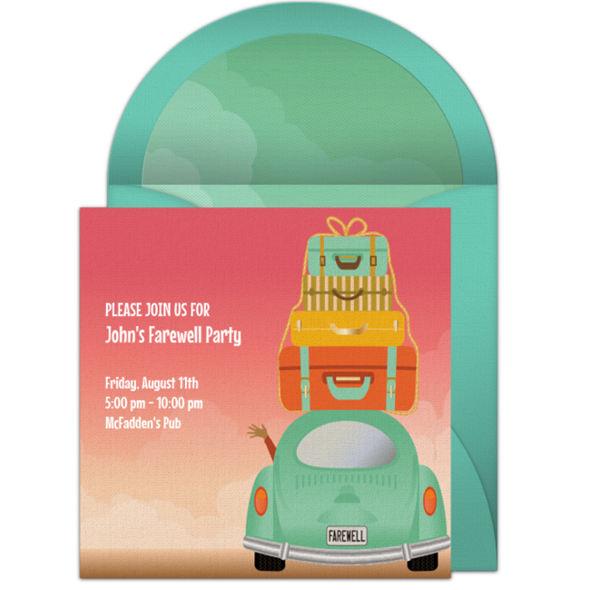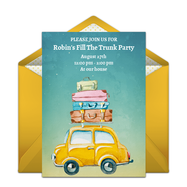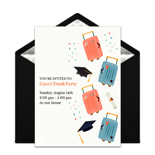 Ready to host a trunk party to send your child off to college? Let's start with some trunk party invitations! You can choose whimsical car trunk or suitcase designs, a classic graduation design, or a design that matches the graduate's college colors. You can even upload a photo of the graduate to select designs. Punchbowl's online invitations offer you so many different options, and they can all be delivered instantly by email or text.