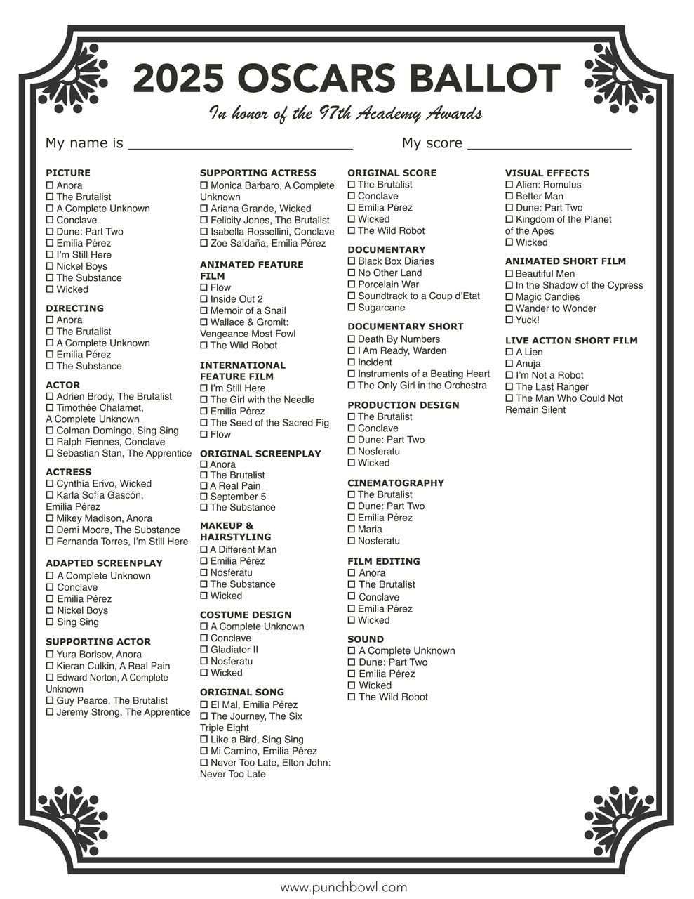 Celebrate the glitz and glamour of the Academy Awards with a fun Oscars party! To get guests chatting, pass out our free Oscars Ballot and have everyone fill one out. Guests will make their predictions before the show starts, and the person with the most correct guesses wins! We love this fun idea – add a "house rule" that these categories earn 3 points each instead of 1: Best Picture, Director, Actor, Actress, Supporting Actor, and Supporting Actress!