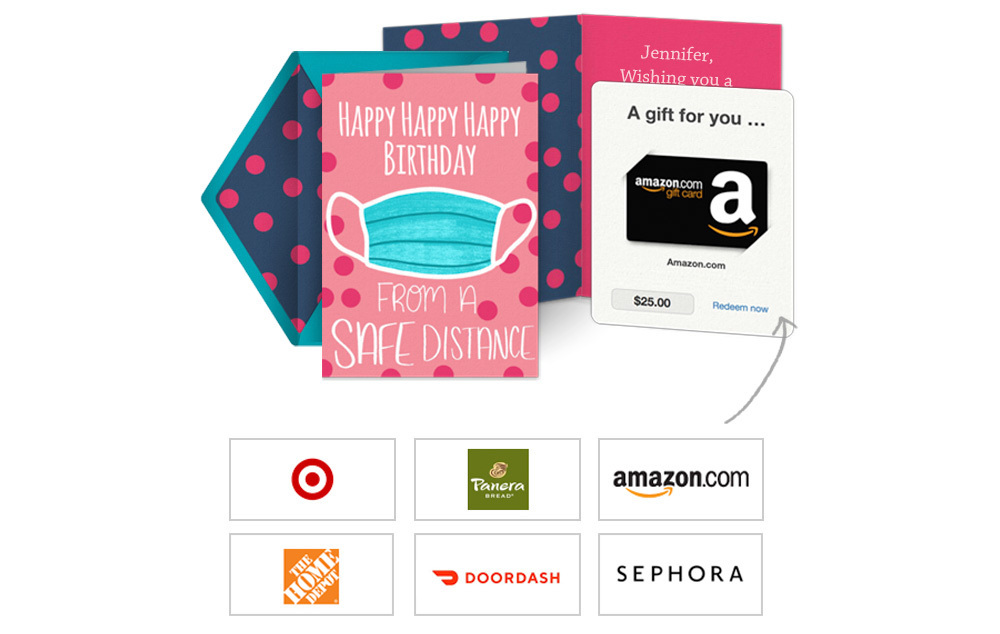 Include a Thoughtful Gift Card: eCards on Punchbowl® include the option to attach a gift card from a brand your recipient will love. It’s the perfect solution for Birthdays, Anniversaries, and Holidays. See a full list of gift cards on Punchbowl® including Amazon.com, Target, Panera, Sephora, The Home Depot, and Doordash.