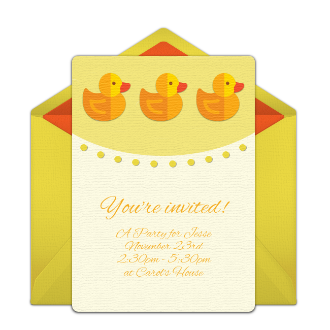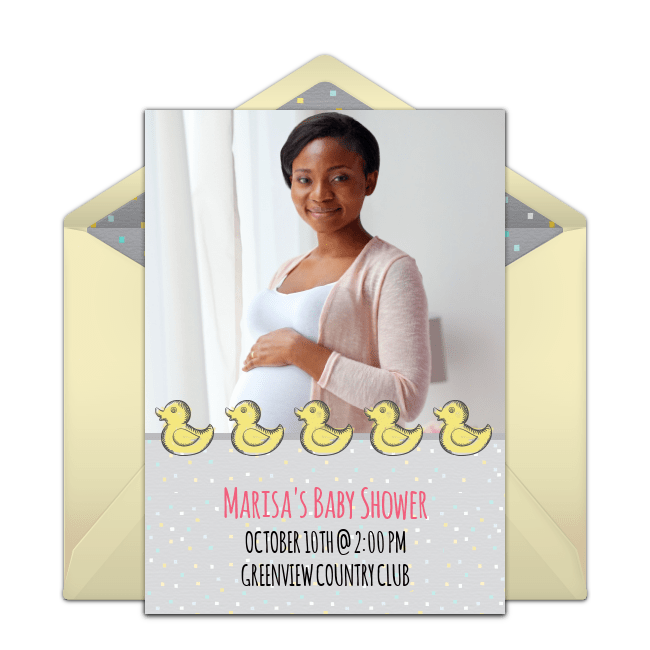 Customize these cute Rubber Duck baby shower invitations with important event information then send them to guests by email or text instantly! Want to include a picture of the mom-to-be in your invite? Personalize these adorable Photo Rubber Ducky baby shower invitations that feature a lovely confetti design and matching envelope liner.