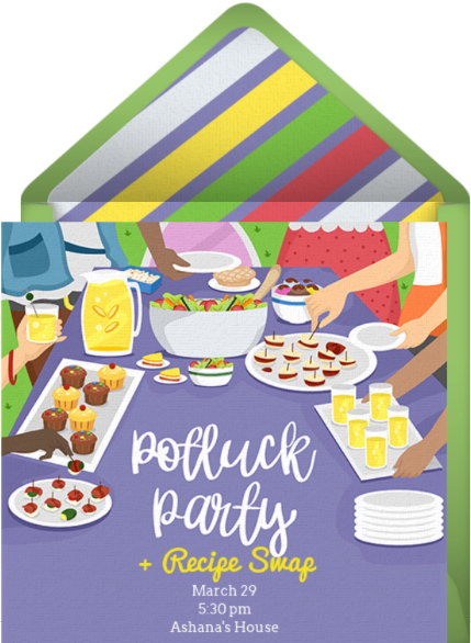 A spring potluck and recipe exchange is a great way to show off your cooking skills and gain some cooking knowledge of your own. Find your favorite potluck invitation, then use the Potluck sign up tool to ask guests to bring a spring dish to the party, such as an appetizer, main course, or dessert. Don't fret: the Potluck Feature ensures you won't have duplicate dishes or too many desserts!