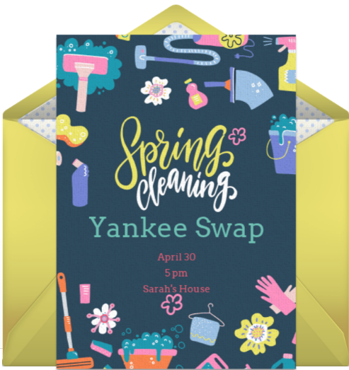 A spring cleaning yankee swap is a fun and exciting spring party theme. The idea behind the theme is for guests to bring an unwanted item from their homes (as a result of spring cleaning) and trade with a guest at the party. Start with a spring cleaning party invitation, add important event details and explain how the party will work, then text or email your invite to guests.