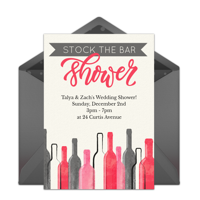 - Invitations: Send stock the bar invitations to guests to invite them to the shower. Browse Punchbowl's selection of wedding shower invitations to find a design that will be sure to knock the corks out of the wine bottles! Use wording on the stock the bar shower invitations such as, "Sip some wine, drink some beer, the shower everyone has been waiting for is almost here! Please join us for a stock the bar bridal shower honoring..." Include the event's date, time, and location. On the stock the bar invites, include a line that says, “As a portion of the shower gift, bring a bottle of wine or hard liquor for the bride!”