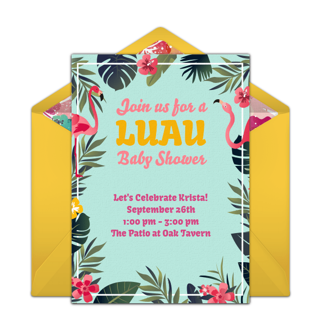 Let the mom-to-be escape to a tropical paradise with a luau baby shower. Customize and send luau baby shower invitations featuring tropical greens, flowers, and flamingos, then start decorating! Purchase real or artifical tropical plants including hibiscus and plumeria, colorful leis, grass table skirts, and tiki torches. Play relaxing, Hawaiian music and incorporate traditional Hawaiian ingredients like coconut and pineapple into your luau foods. Give guests fun party favors like a floating flower candle or flip flops.luau-baby-shower-invitations.png238.93 KB