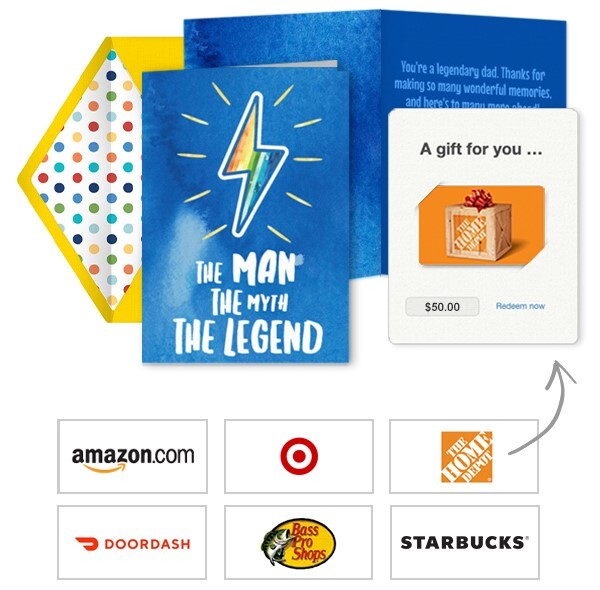 Once you pick your favorite Father’s Day card, our platform will automatically prompt you to add a gift card to your card. Browse our collection of gift card brands, which include Amazon.com, The Home Depot, Panera, Bass Pro Shops, Dollar Shave Club, Target, Autozone, and more. You can email Father’s Day gift cards from any device or text Father’s Day gift cards right from your phone. No trip to the store or post office required!