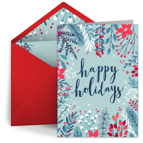 • Illustrated Happy Holidays eCard: Gorgeous holiday flowers and holly deck the halls of this design! This eCard features a matching envelope liner and plenty of room to add a little paragraph of family news from the past year.
