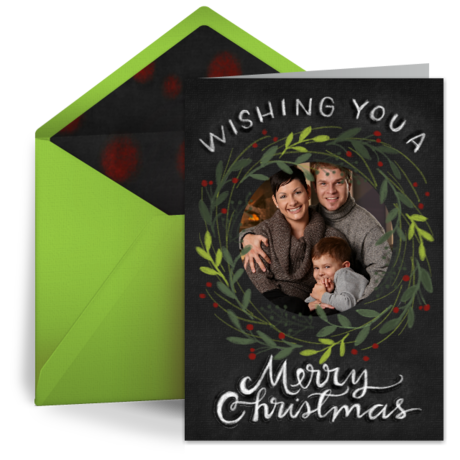 • Chalkboard Christmas Photo eCard: A gorgeous wreath of holly set against a chalkboard background frames a photo of your choice. This easy-to-personalize free eCard is a beautiful way to share your holiday greetings.