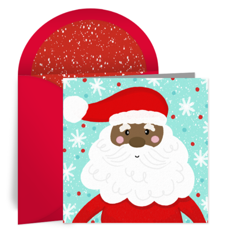• Happy Santa eCard Wish family and friends a holly, jolly Christmas with this cute design featuring a multicultural Santa against a snowy backdrop. The red and aqua colors help make this free eCard extra bright and cheery for holiday greetings that are perfect for a child, too!