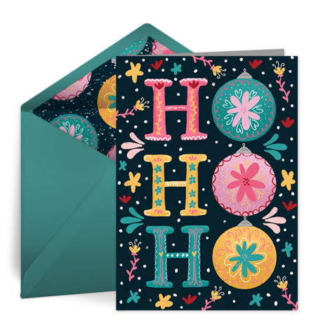 • HO HO HO Ornaments: Send your Christmas greetings in this beautiful eCard featuring elaborate decorations.