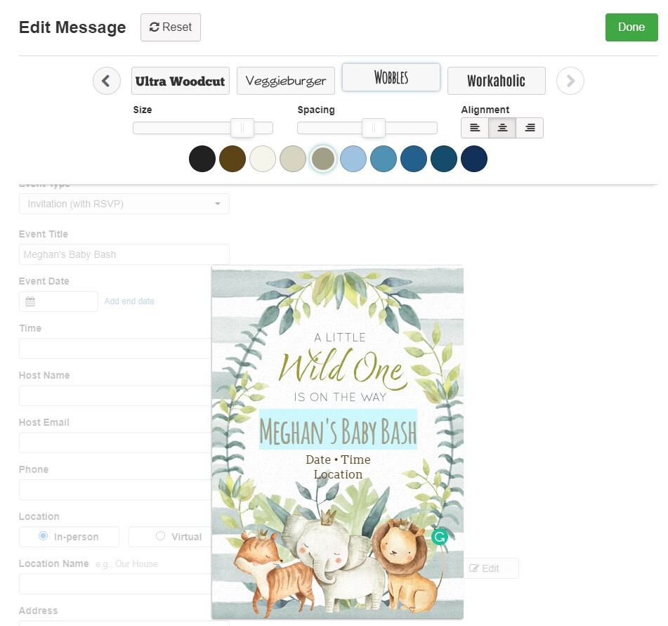 First - when you create an invitation from one of our online templates, you can enter the title of your event and choose the style of how that title will appear. Different fonts in different colors, sizes, spacing, alignment, and more. You just have to highlight the text that you want to edit in order to get started. When you've created the perfect look for your invitation, you can continue to the next step!