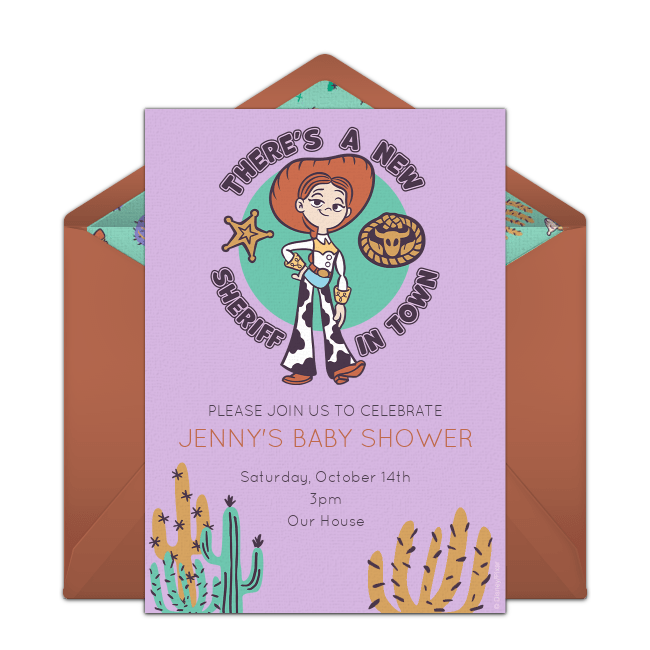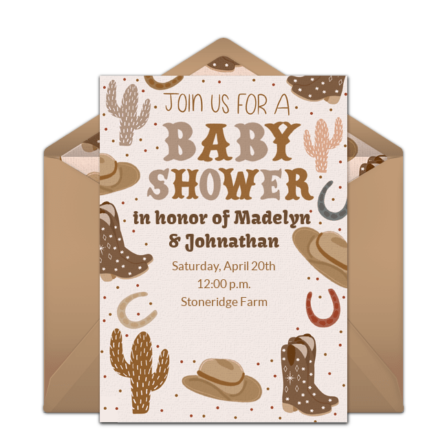 Set the stage for your celebration with these adorable Cowboy baby shower invitations that feature cowboy boots, hats, cacti, and horseshoes, or send these Toy Story Western baby shower invitations that feature Sheriff Jessie (perfect for a baby girl!). Add important event details to your invitation then deliver them by text or email in minutes. Guests can easily RSVP from their phones and hosts can track responses online.